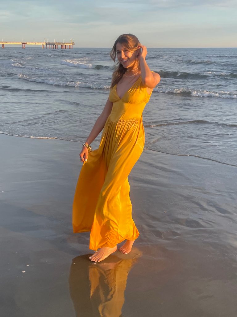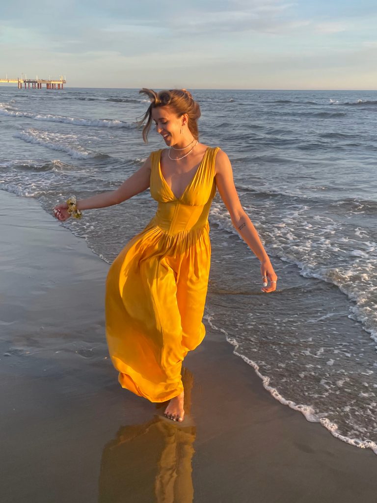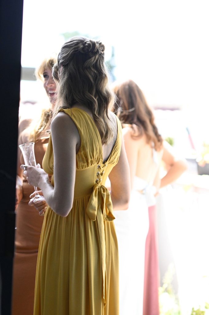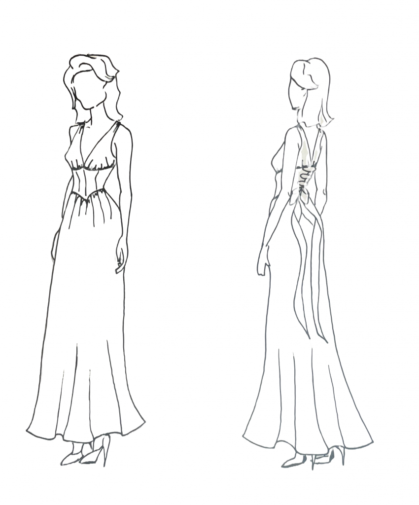 Personal Project – As a bridesmaid for a friend’s wedding, I wanted to create a dress that was understated, yet graceful and flattering. Featuring a deep V-neckline, a close-fitting corset bodice, and a flowing skirt, the design subtly enhances the feminine silhouette. Each bridesmaid was asked to wear a different colour that would complement the others, so I chose a beautiful sunflower yellow satin sourced from deadstock fabric.